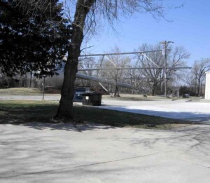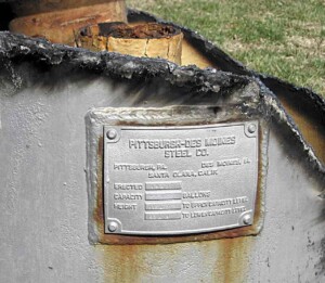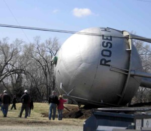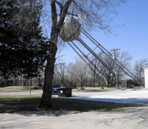 Preferred Tank and Tower Company out of Henderson KY, orchestrated the felling of the 115 foot, 50,000 gallon tower, which had been erected in 1960, as was stated on the plaque on the stump of the main stand pipe. As part of the contract, they will return to cut up and remove the tower and sell it out as scrap to a company in Wichita.